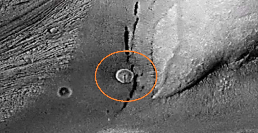 The disk-shaped object in the center of the above photo, and enlarged on the right, was recently found within a photo taken by NASA’s Mars Reconnaissance Orbiter on April 29,